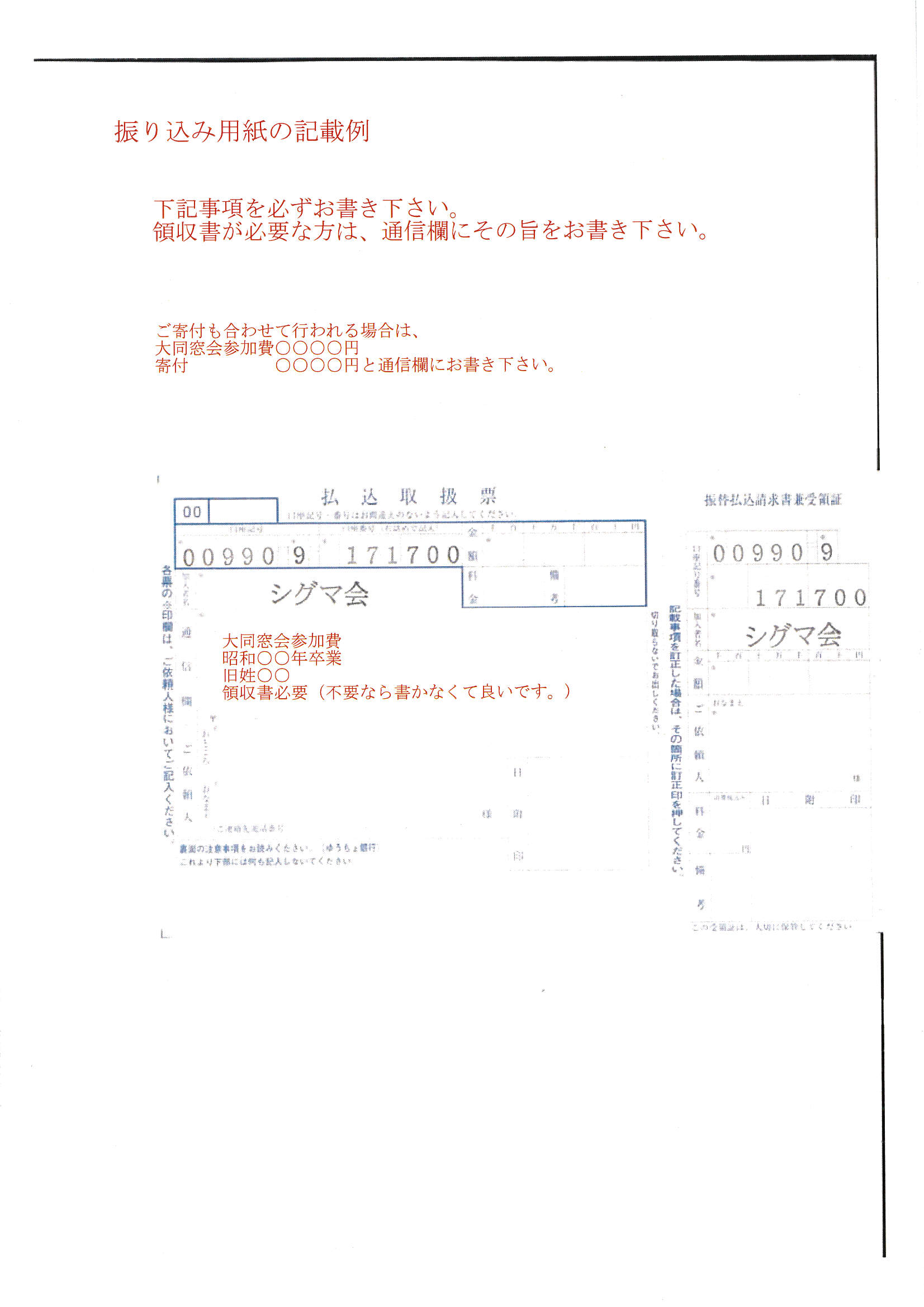 領収書の必要な方は、その旨を振り込み用紙に記載下さい。
